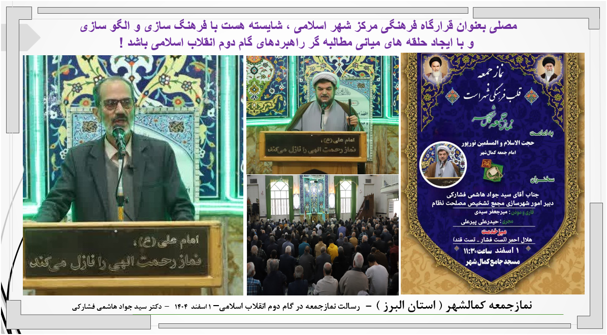 نمازجمعه کمالشهر ( استان البرز) – 1 بهمن 1404 - « رسالت نمازجمعه در گام دوم انقلاب اسلامی » - دکتر سید جواد هاشمی فشارکی