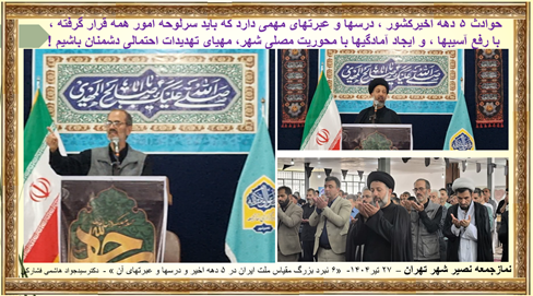 نمازجمعه نصیر شهر تهران– 27 تیر 1404 - « 6 نبرد بزرگ ملت ایران در 5 دهه اخیر و درسها و عبرتهای آن » - بمناسبت 27 تیر سالگرد پذیرش قطعه نامه 598 - دکتر سید جواد هاشمی فشارکی